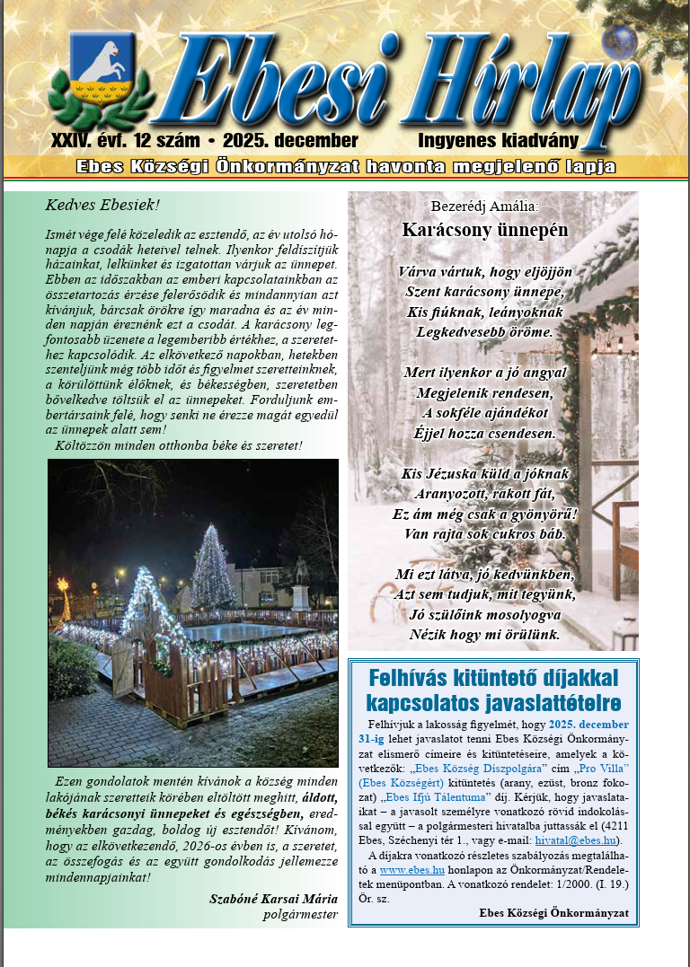 Megjelent az Ebesi Hírlap 2025. decemberi száma, amely letölthető a következő linkről: