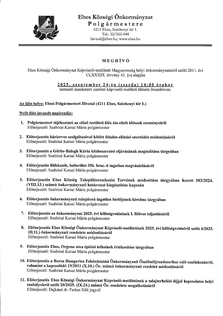 szeptember 24-én (szerda) 14:00 órakor tartandó testületi ülésre
