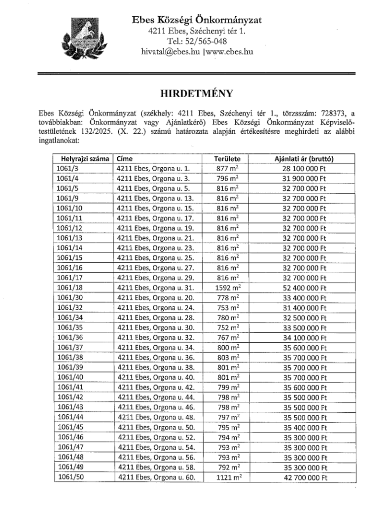 Az ingatlanokkal, továbbá az értékesítési eljárással kapcsolatban további felvilágosítás az 52/565-048-as telefonszámon Szabóné Karsai Mária polgármestertől kérhető.